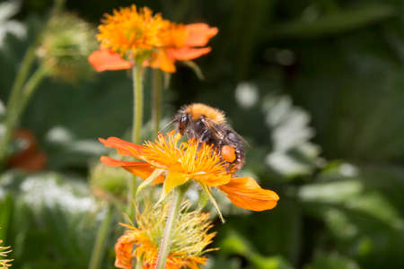 Bumble bee on orange flower close up image.
