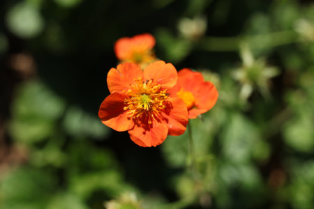 Macro shot of the Geum heldrichii flowering with saucer-shaped, bright orange flowers in loose clusters in bright sunlight in spring