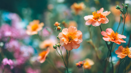 Vibrant orange geum coccineum flower stands tall in a field of blossoms, its delicate petals catching the light as unopened buds promise more beauty to come