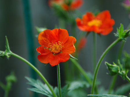 Orange flower of Geum coccineum Scarlet avens blooming in spring garden. Dwarf orange avens, Geum coccineum Feuermeer. Chilean avens or Geum chiloense, Floral background
