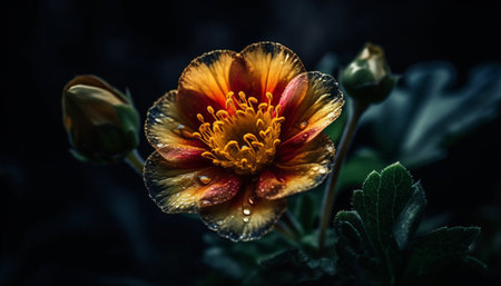 AI Generated. Three pink and yellow flowers with green leaves in the foreground on a dark background with one flower in the foreground