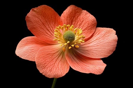Delicate peach flower with vibrant yellow stamens on a black background, showcasing intricate petal textures and seasonal beauty in nature