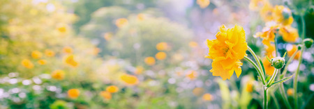 Yellow flowers Geum panorama on blurred summer garden or park background banner for website