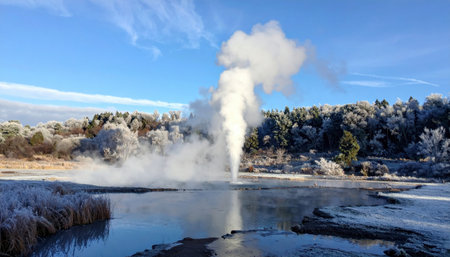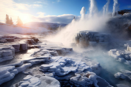 A powerful geyser releasing a forceful stream of water, shooting it high into the sky, Steaming geysers surrounded by fluffy snow in a icy landscape, AI Generated