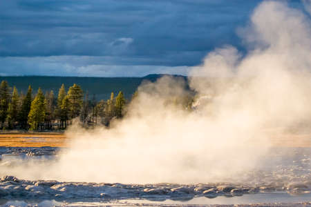 Old Faithful, famous geyser of Yellowstone National Park, Wyoming, USA, exploding hot smoke in the air before next eruption with warm sunlight at sunrise.