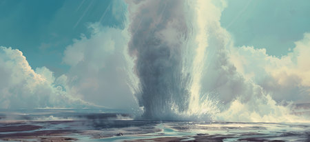 A large geyser erupting from the ground with a cloudy sky, AI