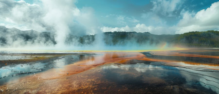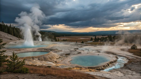 Hot spring Geyser with colorful water in American Landscape. Cloudy Sunset Sky Art Render. Yellowstone National Park, Wyoming, United States. Nature Background Panorama