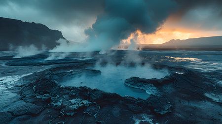Powerful geothermal geysers emitting steam in a natural landscape at sunrise