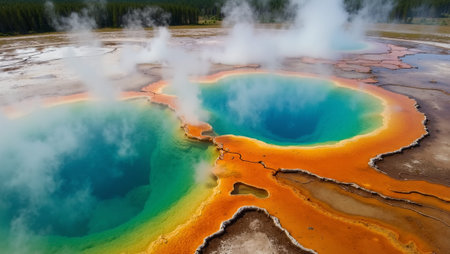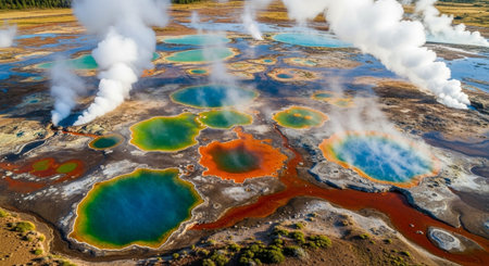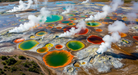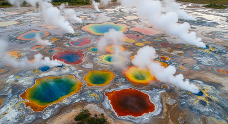 Discover a stunning aerial perspective of vibrant geothermal springs, showcasing rich colors and intricate patterns in the natural landscape, blending water and earth beautifully.