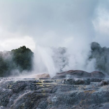 Active geysers erupting above rocks. Rotorua, New Zealand