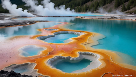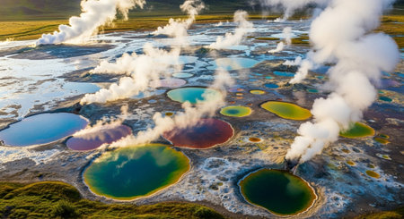 Vibrant geothermal area with steaming hot springs and colorful pools