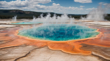 The Grand Prismatic Spring in Yellowstone National Park displays brilliant colors as steam rises from its hot waters, showing the beauty of geothermal features in nature.