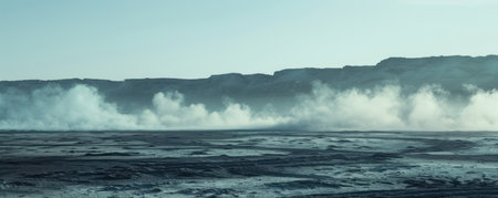 A haunting scene unfolds, where a desolate landscape shrouded in thick fog and smoke stretches endlessly Barren and lifeless, the land whispers of nature's raw power, leaving behind a chilling emptiness The mist clings to everything, creating an atmosphere of eerie isolation AI Generative