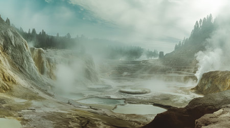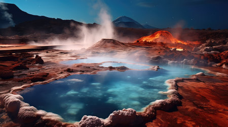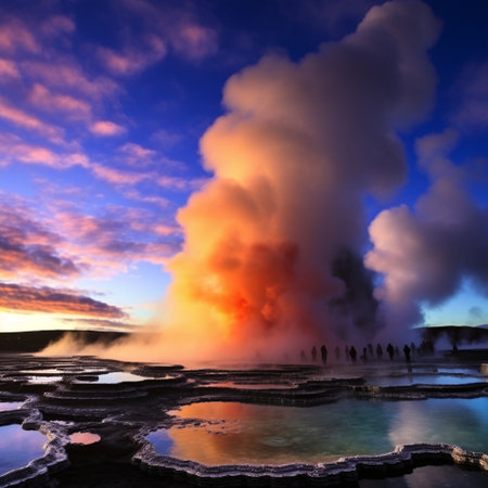 Get ready to be captivated by the mesmerizing beauty and power of geysers and hot springs in this enchanting image. Immerse yourself in a scene where vibrant, ethereal colors mingle with billowing clouds of steam, evoking a sense of awe and wonder. Watch as a diverse group of individuals poses in awestruck admiration, truly captivated by the geothermal spectacle before them. Feel the tranquility seep in as you witness the perfect harmony between nature's forces and human curiosity. This composition skillfully combines realistic elements with a touch of fantasy, creating an artwork that is filled with breathtaking details.