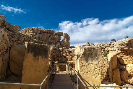 View of stone structures of ancient Ggantija Temples in Gozo Malta, on cloudy blue sky background.