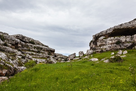 landscape of a gorge (in italy these formations are known as gravina) with caves and slopes