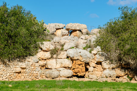 Ancient megalithic Ä gantija Temples, a UNESCO World Heritage site on Xagħra plateau, featuring massive limestone blocks and original Neolithic stone architecture under a clear spring sky
