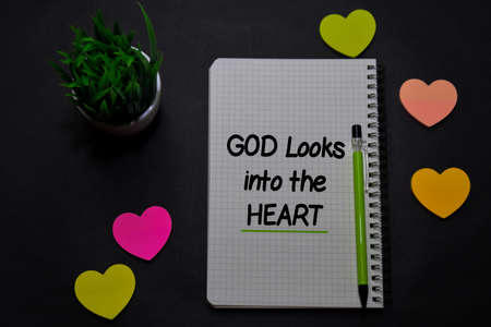 God Looks Into The Heart write on a book isolated on office desk. Christian faith concept