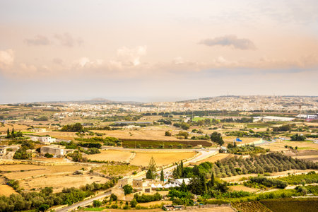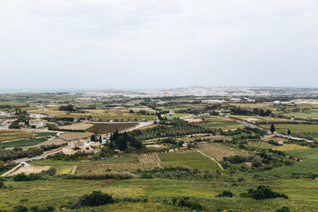 Panorama view of agricultural fields. Aerial view on lands around Mdina, Malta.