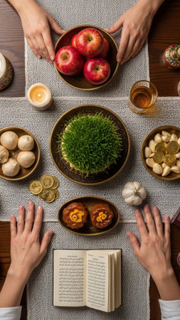 Traditional Haft-Seen table display for Nowruz. Overhead flat lay showing the seven symbolic items, including sabzeh, sib, and sekeh, emphasizing Persian culture.