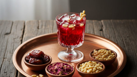 Cinematic wide shot of refreshing Jallab (Middle Eastern molasses drink) in a crystal glass on a copper tray with raw ingredients. Natural light.