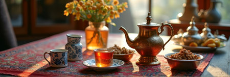 Cozy tea setting with sunlit copper teapot and floral arrangement. That the image is generated using AI.
