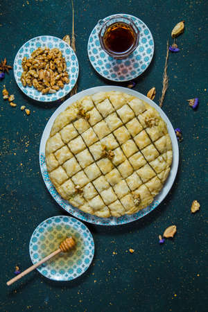 Top view of turkish dessert on table with walnuts and tea. Arabic baklava on table with walnuts, cup with tea and honey dipper.