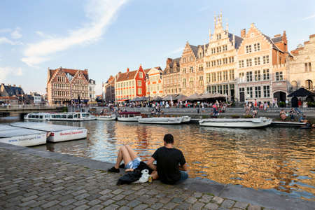 Ghent, Belgium - March 31, 2019: People at the banks of the canal in the Old Town of Ghent, the capital of the East Flanders province in Belgium.