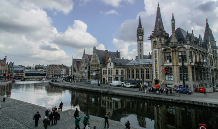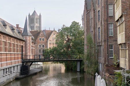 GHENT, BELGIUM - APRIL 16, 2017: View of the canal and tower in the historic centre city of Ghent. Belgium