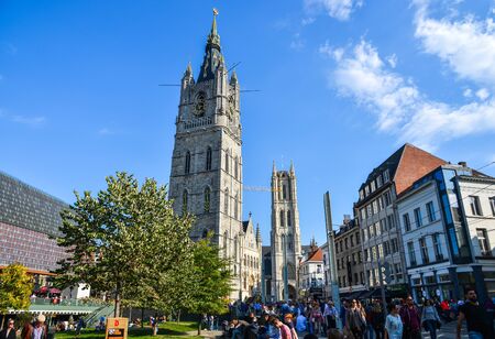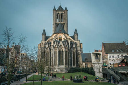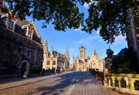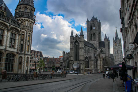 The historic city center in Ghent (Gent), Belgium. Architecture and landmark of Ghent. Cityscape of Ghent. Cathedral.