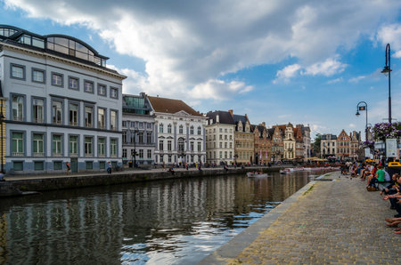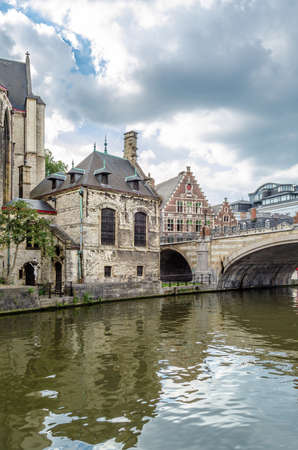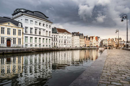 View of embankment of Leie river in the historic city center in Ghent (Gent), Belgium. Architecture and landmark of Ghent. Cityscape of Ghent.