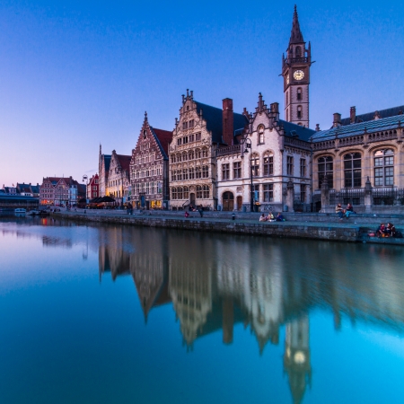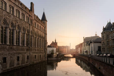 View of the Belgian city of Ghent at sunset with medieval buildings on the banks of the canal.
