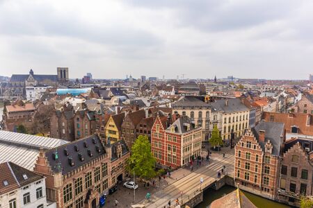 Ghent, Belgium - APRIL 6, 2019: View from the top of the city Ghent. Belgium