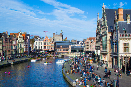 Ghent, Belgium; 10/26/2019: Most famous canal in Ghent, Belgium, through Leie river (Lys river), with typical colorful belgian houses at both sides and people going out