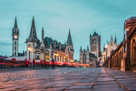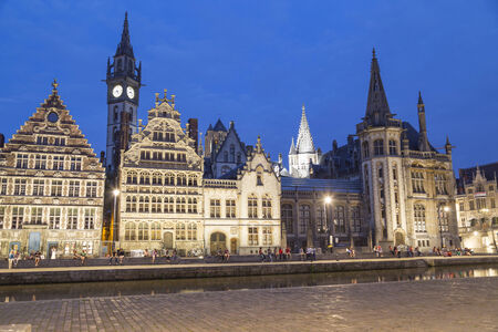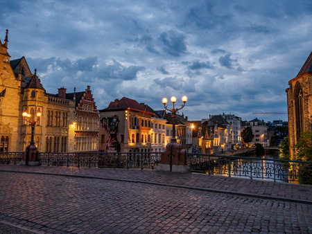 GHENT, BELGIUM - AUG 24, 2022: Architecture of the historic city center of Ghent in the Flemish Region of Belgium, after sunset