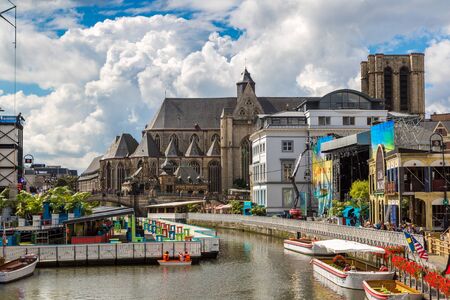 Beautiful medieval city of Ghent with Gothic cathedral in the background