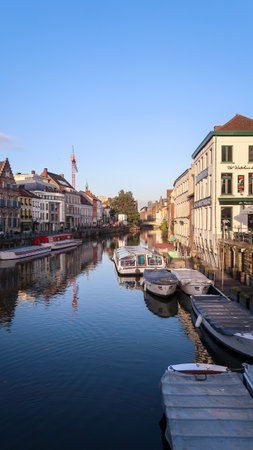Ghent, Belgium - Oct 6, 2018. View of Ghent cityscape with Leie River. Ghent is the Belgium most beautiful city, rich in history, and attracting tourists.