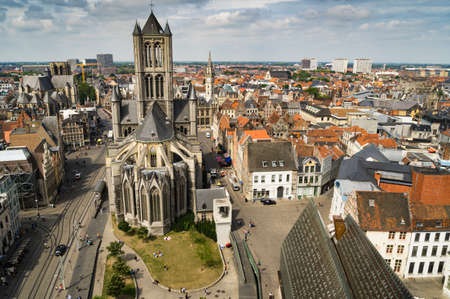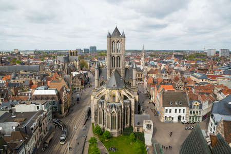 Aerial view of the city of Ghent in Belgium with the cathedral in the foreground.