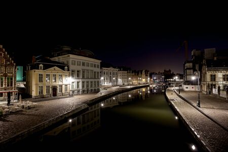 GHENT, BELGIUM - DECEMBER 11: River reflection at night on December 11 in Ghent, Belgium.