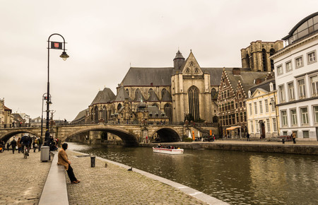 Belgium, Ghent - canal and medieval buildings in popular touristic city