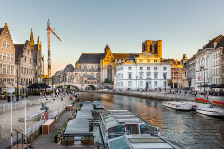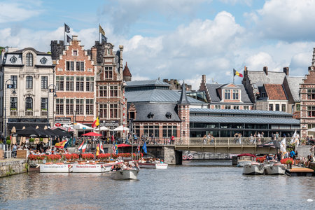 Ghent, Belgium, September 2021: Canal view on the Graslei in Ghent, Belgium.