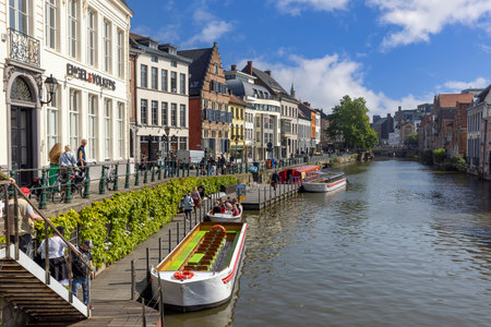 Ghent, Belgium - May 19, 2023: View from Kleine Vismarkt bridge of the historic waterfront Kraanlei on Lys river (Leie).Colorful tenement houses and moored tourist boats