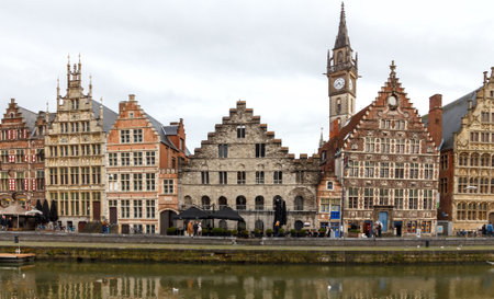 Picturesque medieval buildings overlooking the Graslei harbor on Leie river in Ghent town, Belgium, Europe.
