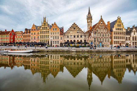 Picturesque medieval buildings overlooking the Graslei harbor on Leie river in Ghent town, Belgium, Europe.