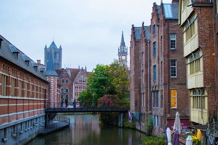 Street, river and medieval houses of Ghent, a city in the Flemish region of Belgium. Travel concept High quality photo