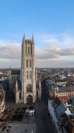 The historic city center in Ghent (Gent), Belgium. Architecture and landmark of Ghent. Cityscape of Ghent. Cathedral.