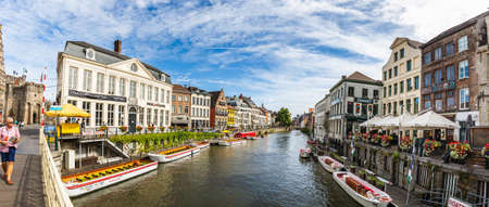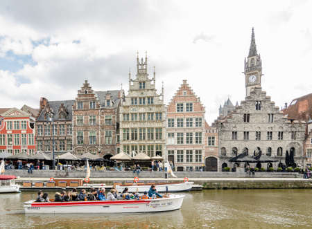 GENT, BELGIUM - JULY 6, 2016 : View of Graslei and Korenlei between medieval architecture buildings with tourist boats in Gent canal. Gent is popular place in Belgium.