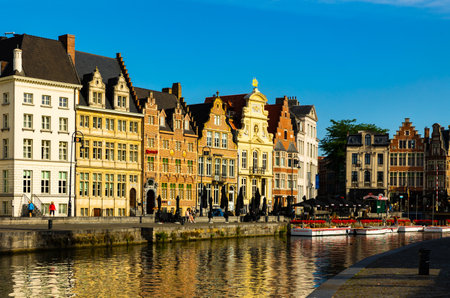 Ghent, Belgium - July 31, 2016: Embankment Graslei in the historic center of Ghent with picturesque old buildings