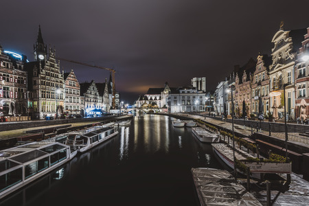 Ghent, Belgium - December 30, 2014: The historic center of Gent, embankment Graslei. Former center of the medieval harbor.