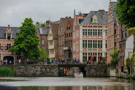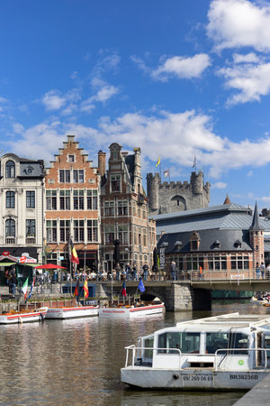 Ghent, Belgium - April 12, 2016: View of old colorful traditional houses along the canal, boats, Gravensteen castle, people walking in popular touristic destination Ghent, Belgium